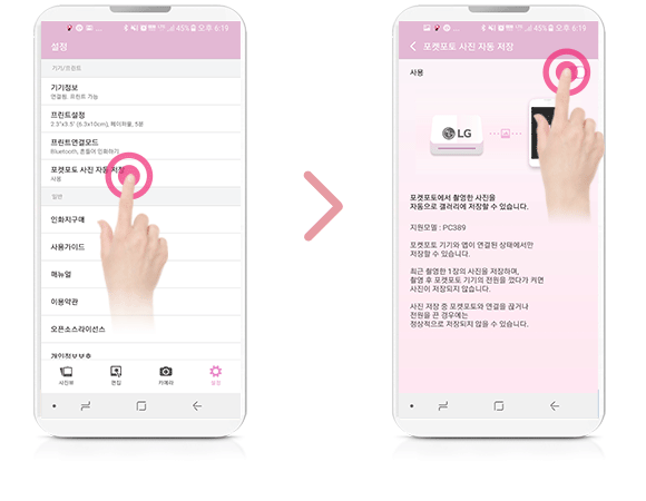 설정]의 [포켓포토 사진 자동 저장]에서 [사용]을 켜세요.