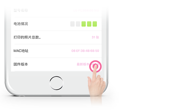 ] (再次打印) 按钮1 秒钟或更长时间。您可以检查设备状况、电池状态、打印照片总数、MAC地址和固件版本。
