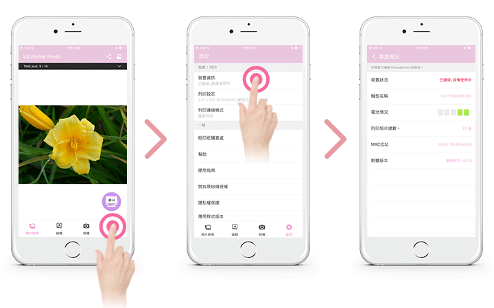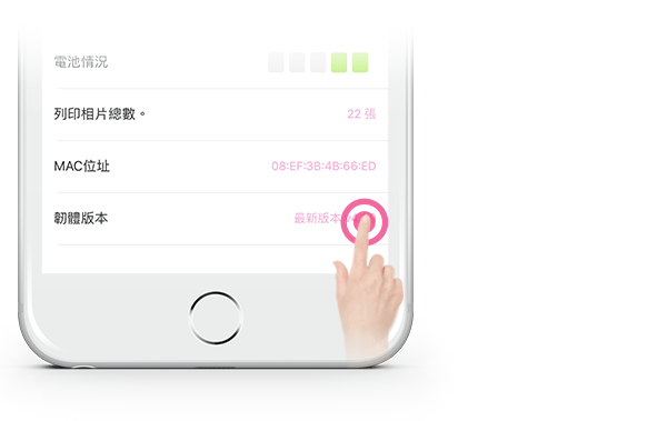 ](再次列印)按鈕超過一秒。您可以檢查裝置情況、電池狀態、已列印相片總數,MAC 位址和韌體版本。