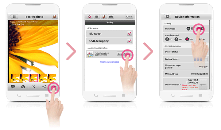 Run LG Pocket Photo App on Android phone.(To check [Device information], set to [On] the Bluetooth of smartphone.)
