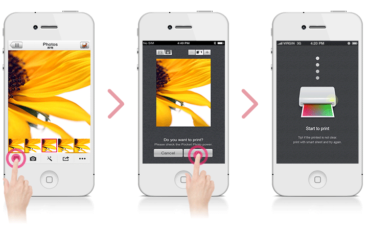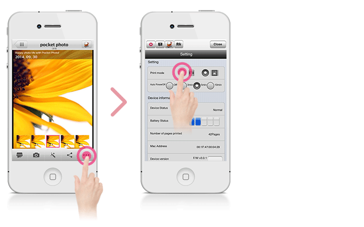 Run LG Pocket Photo App on iPhone. (To check [Device information], set to [On] the Bluetooth of iPhone.)