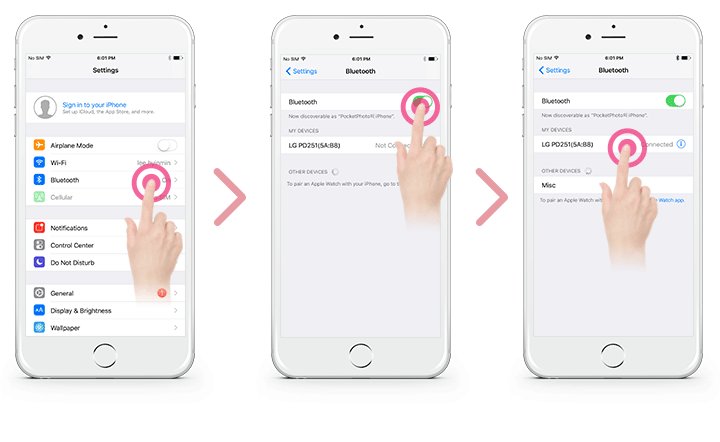 To connect your Pocket Photo device to the iPhone, turn on your device and make sure it is discoverable mode.