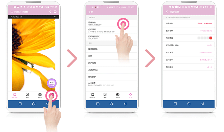 您可以查看设备/电池状态、已打印相片的数 量、MAC地址以及设备版本。而且您也可以更改打 印模式和自动关机设置。