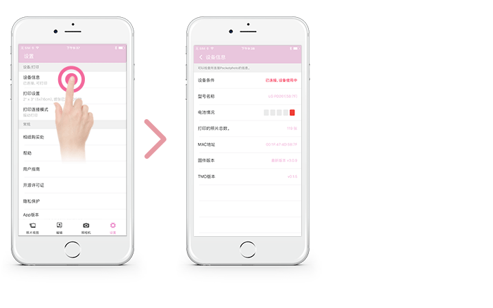 您可以查看设备/电池状态、已打印相片的数 量、MAC地址以及设备版本。而且您也可以更改打 印模式和自动关机设置。