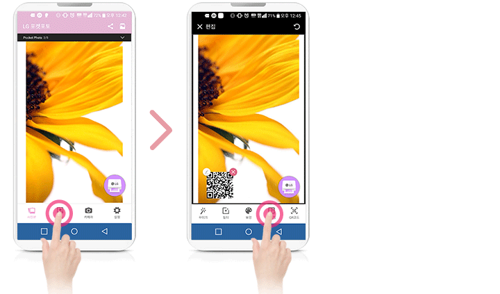 사진과 출력물의 화질이 마음에 들지 않을 때 포켓포토 편집 기능을 활용, 다양한 필터 모드를 통해 이미지 보정 후 사용하세요.
