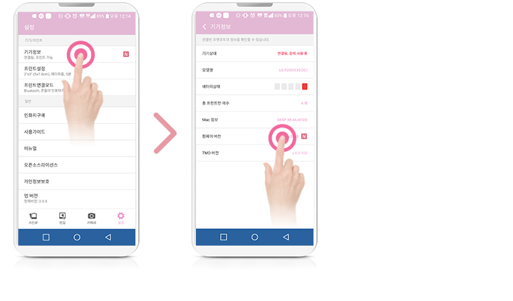 포켓포토 앱을 실행하고 [설정] 버튼을 터치하여 장치정보를 확인 하세요.